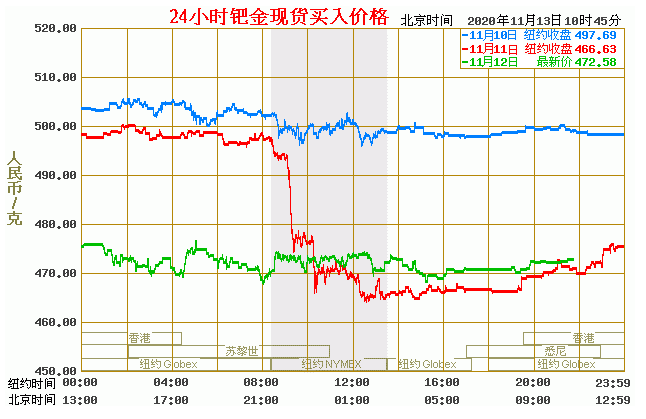 钯金价格走势图今日最新钯金行情(2020年11月13日) 今日最新钯金行情:472.58 备注:以上钯金价格仅供参考,请以官方价格为准。
