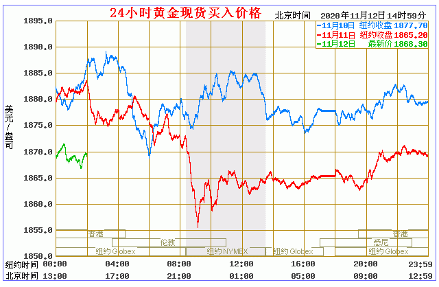 (2020年11月12日)国际黄金价格表 名称 最新价 涨跌 涨跌幅% 买价 卖价 开盘价 昨收价 最高价 最低价