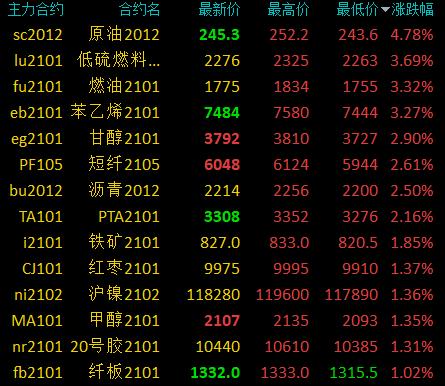 11月10日讯国内期货市场开盘,商品期货多数上涨,能源化工领涨。原油涨约5%,LU、燃油涨超4%,短纤、沥青、G等涨逾3%,R、铁矿等涨超2%,苹果、郑醇、沪镍等涨超1%,焦炭、螺纹等小幅上涨;沪银跌超5%,沪金跌超4%,鸡蛋、豆粕、纯碱等小幅下跌。