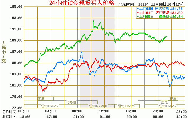 铂金价格走势图今日最新铂金行情(2020年11月6日) 今日最新铂金行情:189.84 备注:以上铂金价格仅供参考,请以官方价格为准。