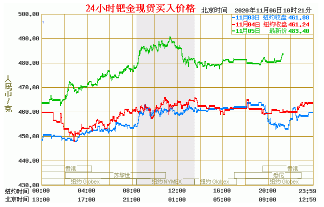 钯金价格走势图今日最新钯金行情(2020年11月6日) 今日最新钯金行情:483.40 备注:以上钯金价格仅供参考,请以官方价格为准。