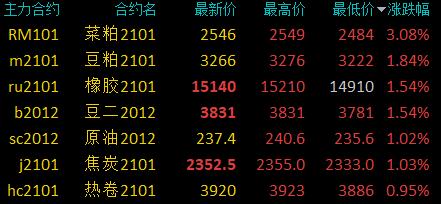 11月5日讯国内期货市场开盘,商品期货涨跌互现,菜粕涨逾3%,原油、豆粕、橡胶、豆二、焦炭涨超1%;焦煤、塑料、郑煤跌超1%。