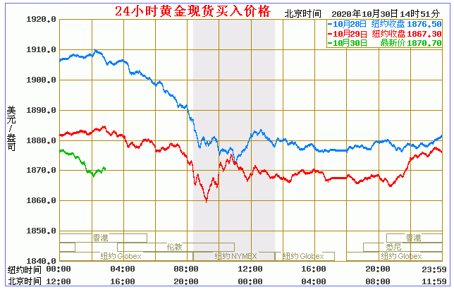 周五(10月30日)美元小幅承压,现货黄金在连跌两日后试图反弹,金价温和上涨,目前交投在1871美元附近,白银扩大涨幅至1%。周五亚股全线走低,未能延续昨日美股反弹的势头。 今日黄金价格走势图(2020年10月30日)