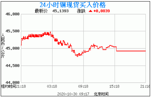 铜价格走势图今日最新铜价行情(2020年10月30日) 今日最新铜价:45.1393涨跌:0.0839 备注:以上铜价格仅供参考,请以官方价格为准。