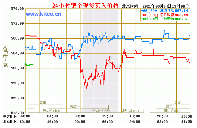 钯金价格走势图今日最新钯金行情(2021年6月4日) 今日最新钯金行情:560.97 备注:以上钯金价格仅供参考,请以官方价格为准。