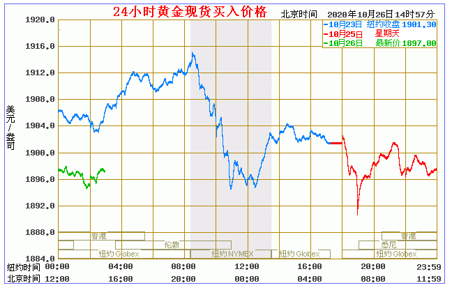 周一(10月26日)亚洲时段,现货黄金小幅下跌,且跌破1900美元/盎司关口,最低报1891.39美元/盎司。 今日黄金价格走势图(2020年10月26日)