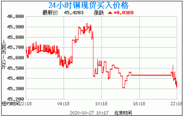 铜价格走势图今日最新铜价行情(2020年10月27日) 今日最新铜价:45.4203涨跌:0.0369 备注:以上铜价格仅供参考,请以官方价格为准。