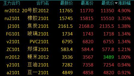 10月27日讯国内期货市场开盘,商品期货涨跌参半,20号胶大涨近5%,橡胶涨超3%,焦炭、玻璃涨逾1%,豆二、沪镍等小幅上涨;鸡蛋、原油、燃油等跌超1%,沪银、苹果、短纤等小幅下跌。