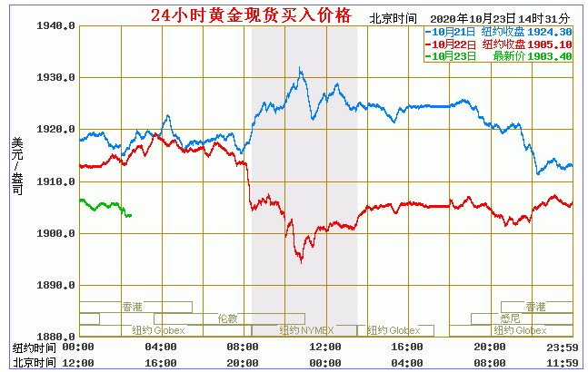(2020年10月23日)国际黄金价格表 名称 最新价 涨跌 涨跌幅% 买价 卖价 开盘价 昨收价 最高价 最低价