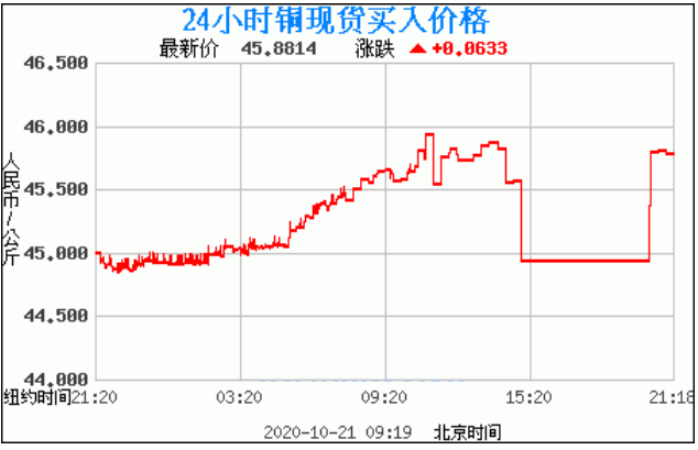 铜价格走势图今日最新铜价行情(2020年10月21日) 今日最新铜价:45.8814涨跌:0.0633 备注:以上铜价格仅供参考,请以官方价格为准。