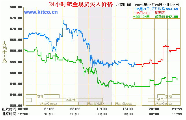 钯金价格走势图今日最新钯金行情(2021年5月25日) 今日最新钯金行情:547.85 备注:以上钯金价格仅供参考,请以官方价格为准。