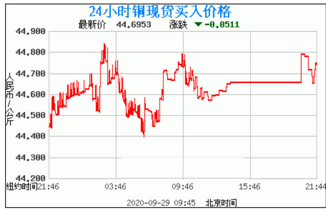 铜价格走势图今日最新铜价行情(2020年9月29日) 今日最新铜价:44.6953涨跌:-0.0511 备注:以上铜价格仅供参考,请以官方价格为准。