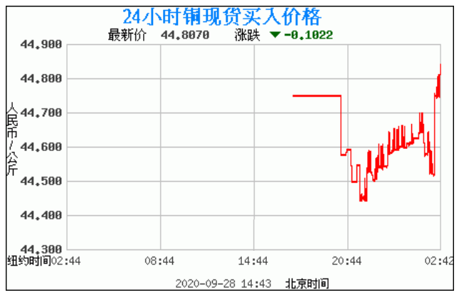 铜价格走势图今日最新铜价行情(2020年9月28日) 今日最新铜价:44.8070涨跌:-0.1022 备注:以上铜价格仅供参考,请以官方价格为准。