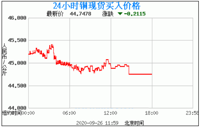 铜价格走势图今日最新铜价行情(2020年9月27日) 今日最新铜价:44.7478涨跌:-0.2115 备注:以上铜价格仅供参考,请以官方价格为准。