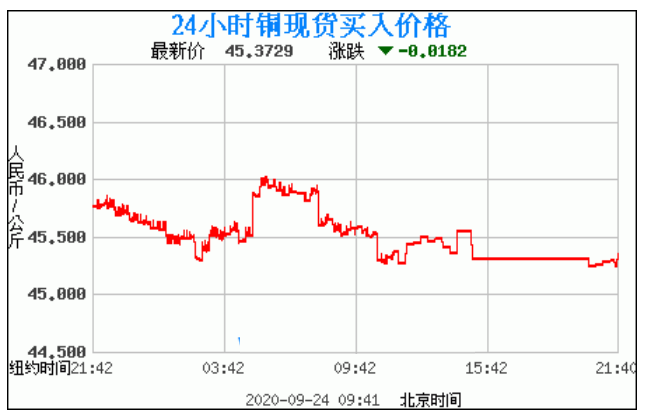 铜价格走势图今日最新铜价行情(2020年9月24日) 今日最新铜价:45.3729涨跌:-0.0182 备注:以上铜价格仅供参考,请以官方价格为准。
