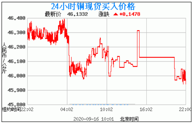 铜价格走势图今日最新铜价行情(2020年9月16日) 今日最新铜价:46.1332涨跌:0.1478 备注:以上铜价格仅供参考,请以官方价格为准。