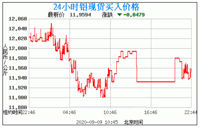 铝锭价格走势图今日最新铝锭行情(2020年9月9日) 今日最新铝锭行情:11.9594 备注:以上钯金价格仅供参考,请以官方价格为准。