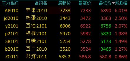 9月8日讯国内期货市场收盘,商品期货涨跌不一,苹果尾盘涨停,涨幅6.01%,鸡蛋、豆油涨超2%,棕榈、豆二、白糖等涨逾1%,纸浆、玉米等小幅上涨;原油跌逾3%,郑醇、焦煤跌超1%,塑料、螺纹等小幅下跌。 A2010合约自8月10日反弹至7300元/吨附近的阶段高点后再度进入下跌模式,但无论是从期价波动幅