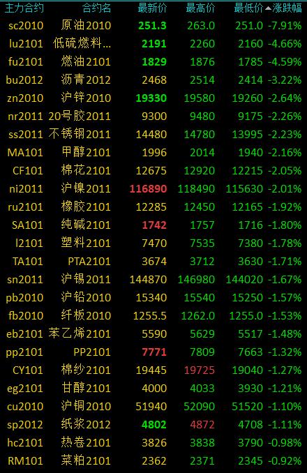 9月9日讯国内期货市场开盘,商品期货多数下跌,能源化工大幅下跌,原油期货开盘跌停,燃油、LU跌超4%,沥青跌逾3%,郑醇、橡胶等跌超2%,TA、等跌超1%,白糖、豆一等小幅下跌;苹果涨超1%,沪金、郑油、鸡蛋等小幅上涨。 国内期市夜盘,上期所原油期货主力合约触及跌停,日内跌幅8%。深夜11点,WTI原油期