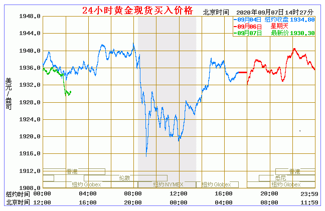 (2020年9月7日)国际黄金价格表 名称 最新价 涨跌 涨跌幅% 买价 卖价 开盘价 昨收价 最高价 最低价