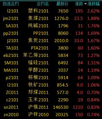 国内期货市场收盘,商品期货多数收涨,化工板块涨幅居前,塑料涨超2%,焦煤、焦炭、、TA、纯碱涨超1%,郑煤、豆油、沥青、沪镍、橡胶小幅上涨;鸡蛋跌超3%,LG跌超2%。 8月上旬鸡蛋价格高位下滑,中旬霉蛋及库存蛋基本消化,养殖单位无意继续低价出货,蛋价触底后反弹。下游环节虽顺势拿货,但
