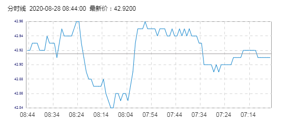 WTI原油价格实时(2020年8月28日) 名称 最新价 涨跌 涨跌幅% 开盘价 昨收价 最高价 最低价 WTI 42.92