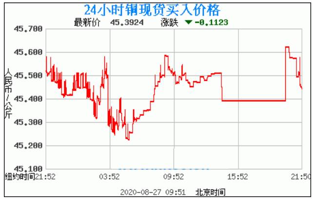 铜价格走势图今日最新铜价行情(2020年8月27日) 今日最新铜价:45.3924涨跌:-0.1123 备注:以上铜价格仅供参考,请以官方价格为准。