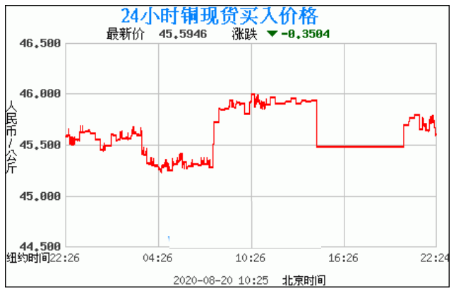 铜价格走势图今日最新铜价行情(2020年8月20日) 今日最新铜价:45.5946涨跌:-0.3504 备注:以上铜价格仅供参考,请以官方价格为准。