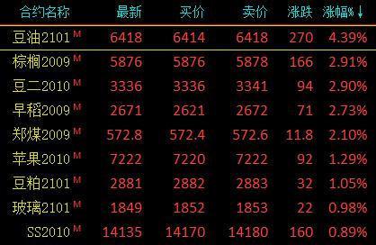 8月13日讯国内期货市场收盘,商品期货涨跌互,贵金属走低,沪银跌超4%,沪金跌超1%;农产品(8.69+3.82%,诊股)多数走高,豆油涨超4%,早稻、棕榈、豆二涨超2%,苹果、豆粕涨超1%。 收储老调重弹油脂焕发新生 油脂延续夜盘大涨走势,豆油飙升逾4%,棕榈油跟涨逾2%,菜油涨幅偏弱。昨日有传闻称国