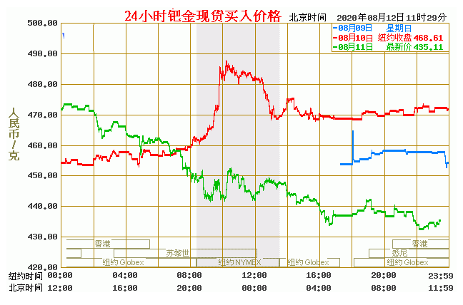 钯金价格走势图今日最新钯金行情(2020年8月12日) 今日最新钯金行情:435.11 备注:以上钯金价格仅供参考,请以官方价格为准。