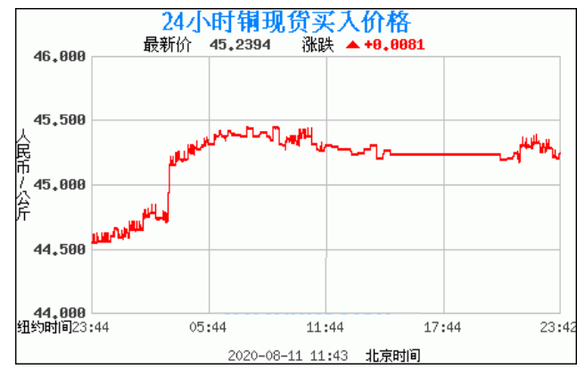 铜价格走势图今日最新铜价行情(2020年8月11日) 今日最新铜价:45.2394涨跌:0.0081 备注:以上铜价格仅供参考,请以官方价格为准。