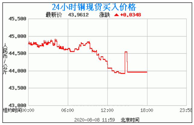 铜价格走势图今日最新铜价行情(2020年8月10日) 今日最新铜价:43.9612涨跌:0.0340 备注:以上铜价格仅供参考,请以官方价格为准。