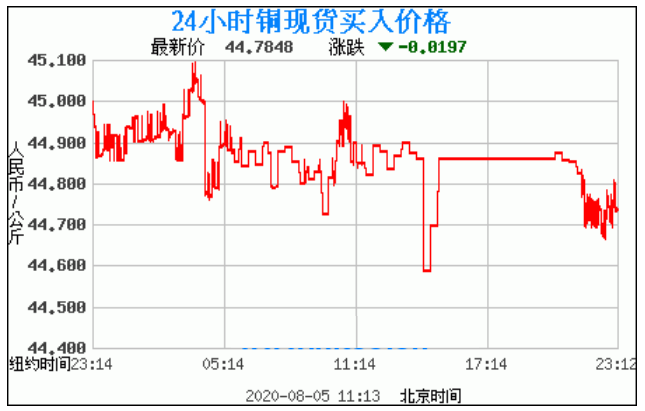 铜价格走势图今日最新铜价行情(2020年8月5日) 今日最新铜价:44.7848涨跌:-0.0197 备注:以上铜价格仅供参考,请以官方价格为准。