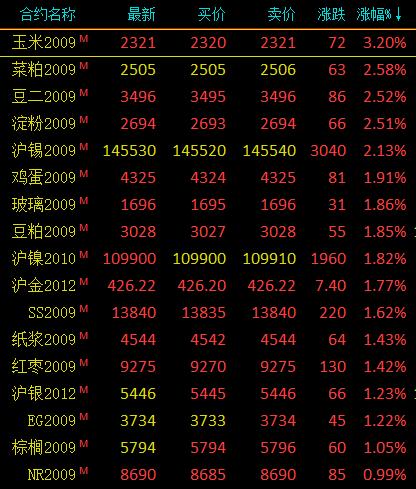 7月27日讯国内期货市场早盘开盘,商品期货涨跌参半,农产品(8.13+2.26%,诊股)多数走高,鸡蛋、菜粕涨近3%,豆二、豆粕、玉米涨逾2%;贵金属走高,沪金涨近2%,沪银涨逾1%。