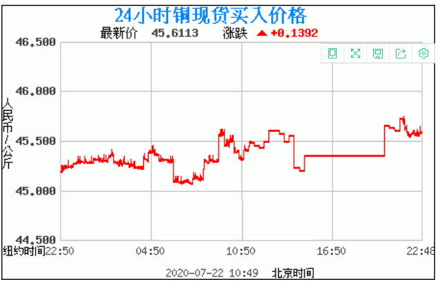 铜价格走势图今日最新铜价行情(2020年7月22日) 今日最新铜价:45.6113涨跌:0.1392 备注:以上铜价格仅供参考,请以官方价格为准。