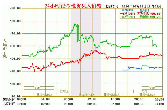 钯金价格走势图今日最新钯金行情(2020年7月22日) 今日最新钯金行情:459.70 备注:以上钯金价格仅供参考,请以官方价格为准。