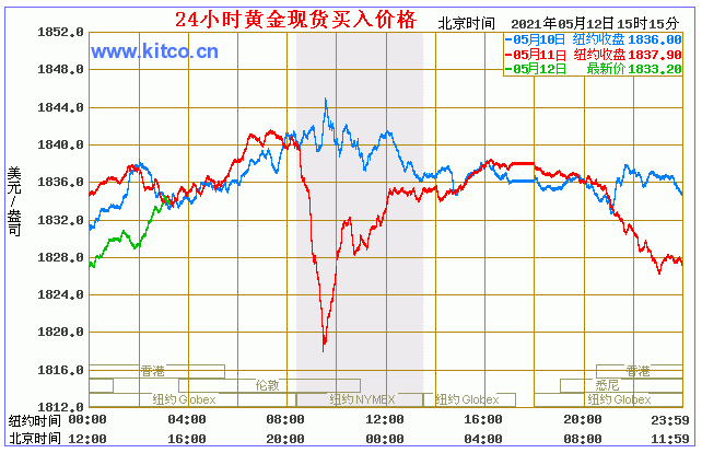 周三(5月12日),国际金价下跌,受美元指数反弹打压。稍晚,美国将公布备受市场关注的消费者物价指数(CI)。北京时间14:48,现货黄金下跌0.26%至1832.95美元/盎司;COX期金主力合约下跌0.14%至1833.6美元/盎司;美元指数上浮0.12%至90.288。 今日黄金价格走势图(2021年5月12日)