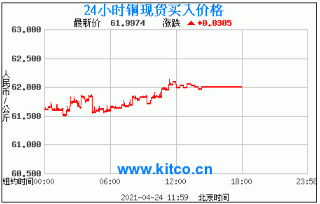铜价格走势图今日最新铜价行情(2021年4月26日) 今日最新铜价:61.9974涨跌:0.0305 备注:以上铜价格仅供参考,请以官方价格为准。