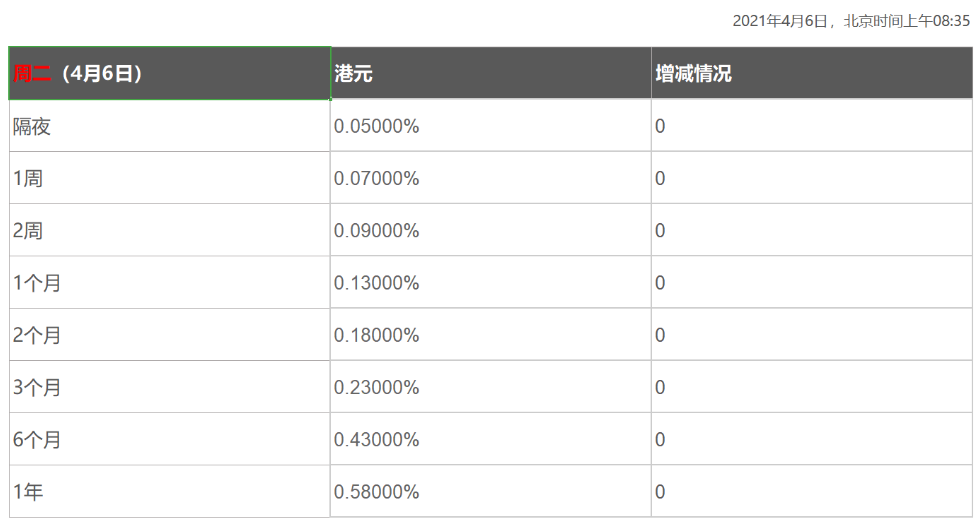 4月6日香港银行间同业拆借利率港币(HIOR): 隔夜报0.05000%,1周期报0.07000%,1月期报0.13000%,3月期报0.23000%,6月期报0.43000%。