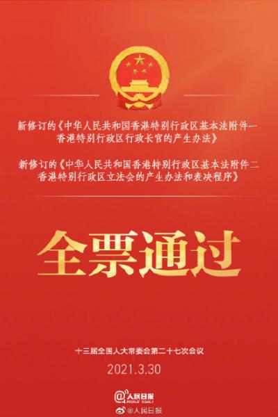 【#外交部就香港基本法附件一二发表谈话#转!香港的前景将更加光明?#香港基本法附件一附件二全票通过#,对香港特区行政长官和立法会产生办法作出系统修改和完善,将为全面准确贯彻“一国两制”方针、落实“爱国者治港”原则、确保香港长治久安提供坚实的制度保障,充分反映了包括香港同胞在内的全体中国人民的共同意愿