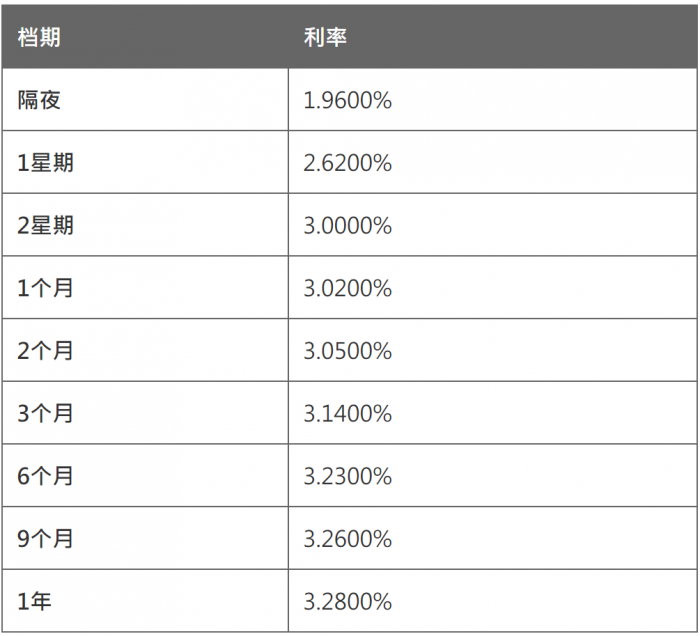 资料更新于香港时间:2021/03/2309:15:02 3月23日香港银行同业人民币拆息HIOR: 隔夜HIOR报1.9600%,一周期HIOR报2.6200%,两周期HIOR报3.0000%; 1个月HIOR报3.0200%,2个月HIOR报3.0500%,3个月HIOR报3.1400%。 注:上述资料仅供参考,人民币拆息将根据本行不时公布的息率为准。