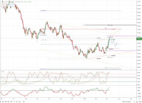 美元指数可能的价格路径和潜在的反转区域 美国就业数据好于预期,美国国库券收益率上升。其中,10年期美国国债收益率上周五上升了近6个基点,至1.624%,创下一年多以来的新高。收益率上升带动了美元汇率。美元指数收盘上涨0.4%,至三个月高点92。每周增长1.2%,也是自去年10月底以来的最大增幅。 美国就业数据有所改善。