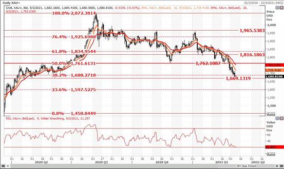 昨日回顾 周一交易,美元上涨和公债殖利率上升再度削弱黄金对投资者的吸引力,使黄金价格下挫至去年4月初以来最低收盘价。在上周末参议院以些微差距表决通过纾困方案后,黄金以下跌开启3月第二周,众议院最早本周二将针对1.9兆美元COVID-19纾困法案进行表决。该财政刺激方案预计将提振黄金,因为这意味政府将增加支出,使避