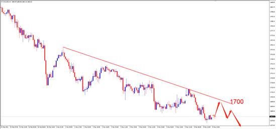 (本文图片当中:红线代表支撑线,绿色代表阻力线,蓝色代表技术转折点,黑色代表报告发出时的即时价位) 黄金 当日内:短期关键阻力位在1696.00 转折点:1696.00 交易策略: 在1696.00之下,看跌,目标价位为1676.00,然后为1668.00。 备选策略: 在1696.00上,看涨,目标价位定