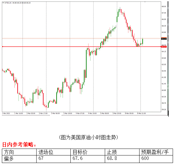 黄金小时图 黄金方面:昨日(3月8日)黄金的反弹再次被强势美元扼杀,市场完全无视1.9万亿美元的纾困方案。经济的走好和美联储对国债收益率走高的放任,短期内黄金难有好的表现。 隔夜美元指数再次创下新高,这是自去年11月以来的最好表现,美元走强背后是美国经济的好转。美国2月就业增幅超预期,结合服