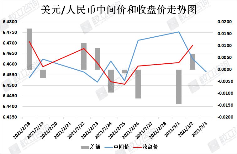 一.美元/人民币汇率 2021/3/3:美元/人民币中间价报6.4565,中间价下调60点。中间价今日略微下调,中间价整体调整幅度依然较校上个交易日收盘价高于中间价,日内波幅波幅较校 【今日研判】:短期内区间震荡为主,今日横盘震荡概率较大。 二.欧元/人民币汇率 2021/3/3:欧元/人民币中间价报7.8016,中