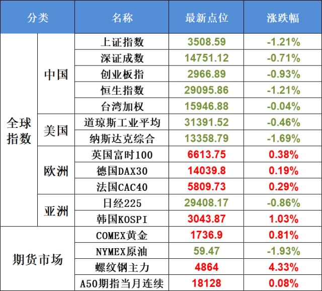 一、A股早报部分 【行情回顾】 昨日,指数持续下跌午后一度集体跌逾1.5%,临近尾盘小幅回升。截至收盘,上证指数跌1.21%,报3508.59点,深证成指跌0.71%,报14751.12点,创业板指跌0.93%,报2966.89点。 板块上,碳中和板块全天强势,环保工程、电力等维持活跃,题材板块多数走弱,有色、造纸、航运等板块跌幅