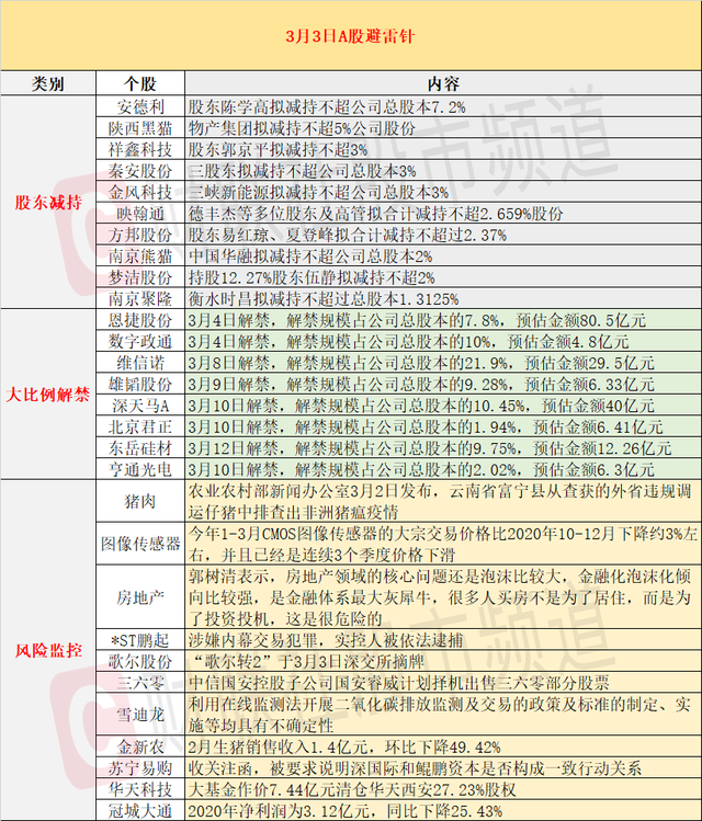 【3月3日早间新闻精芽 宏观新闻 1、李克强对全国春季农业生产工作电视电话会议作出重要批示强调,稳定生猪生产,做好重大动物疫病和病虫害防控,全力保障国家粮食安全和重要农副产品有效供给。 2、银保监会主席郭树清表示,中国金融杠杆率明显下降,金融资产盲目扩张得到根本扭转;把防范风险作为金融业的永恒