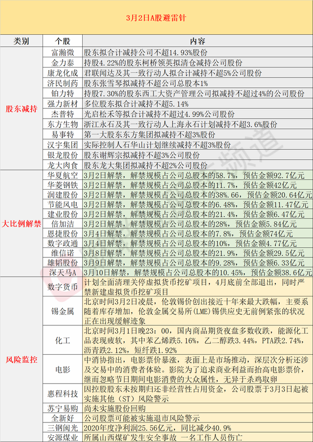 导读:1、富瀚微将迎来近15%的巨量减持;2、内蒙古计划4月底前关停所有虚拟货币挖矿项目;3、全新好或将被实施退市风险警示;4、伦敦金属交易所3月期货锡价格下跌逾11%,创10年来最大单日跌幅;5、新冠病毒变异株在欧洲持续蔓延;6、美联储巴尔金表示,需要关注实体经济的表现,而不是市场波动。 经济信息