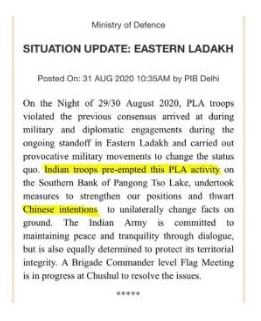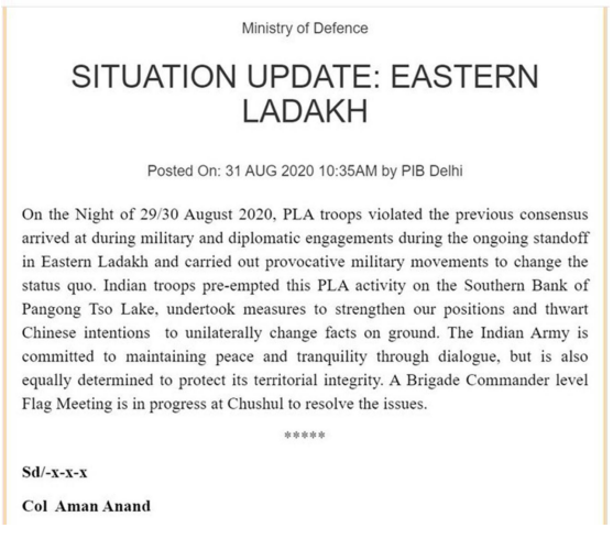 印度军方8月31日发表声明说,2020年8月29日和30日晚,中国人民解放军违反先前在拉达克(Ladakh)东部对峙期间经由军事和外交接触达成的共识,采取挑衅性军事行动改变现状。声明称,印度军队先发制人,在班公湖南岸采取措施加强了印度的阵地,挫败中国单方面改变地面事实的意图。 对此,中国解放军西部战